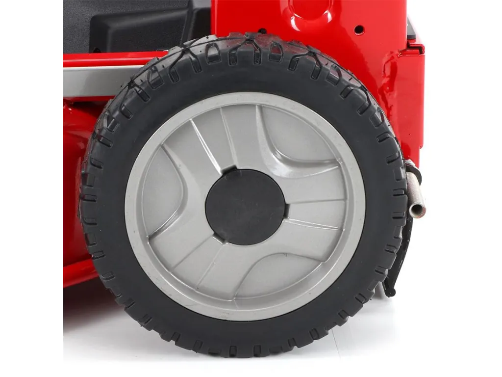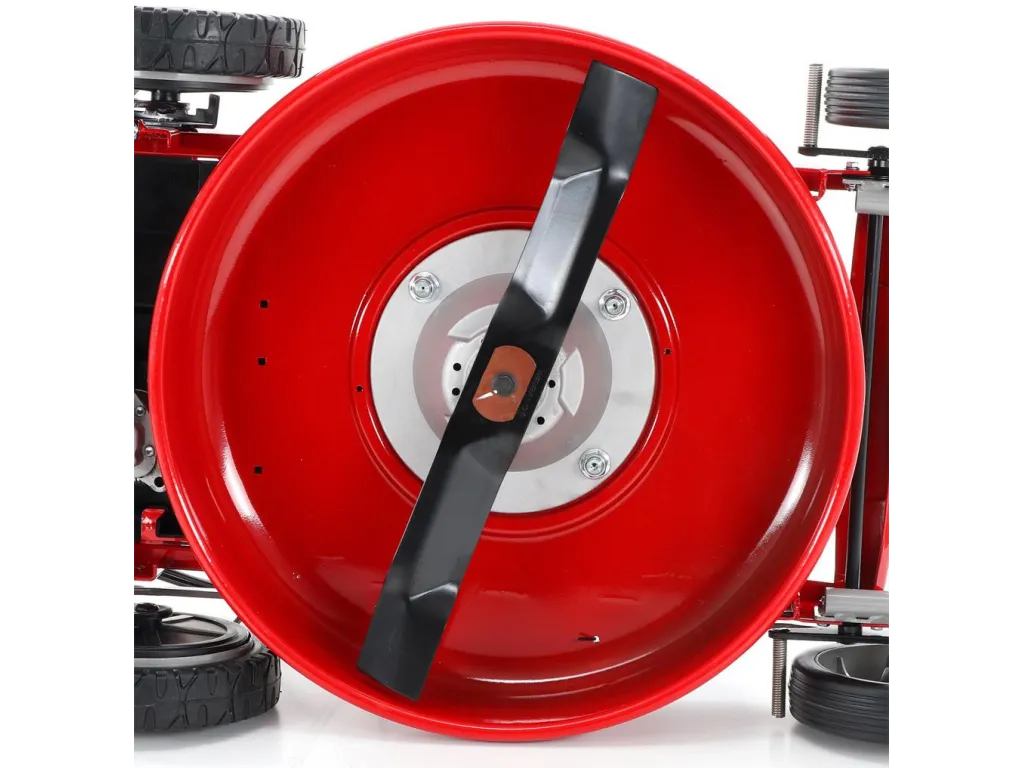Výhoda hodně silného motoru o výkonu 7 HP a speciálnlně tvarovaného silného mulčovacího nože Vám perfektně poseká nízkou i středně vysokou trávu. Pogumovaná sendvičová kola jsou uložena v oboustranných kuličkových ložiscích,