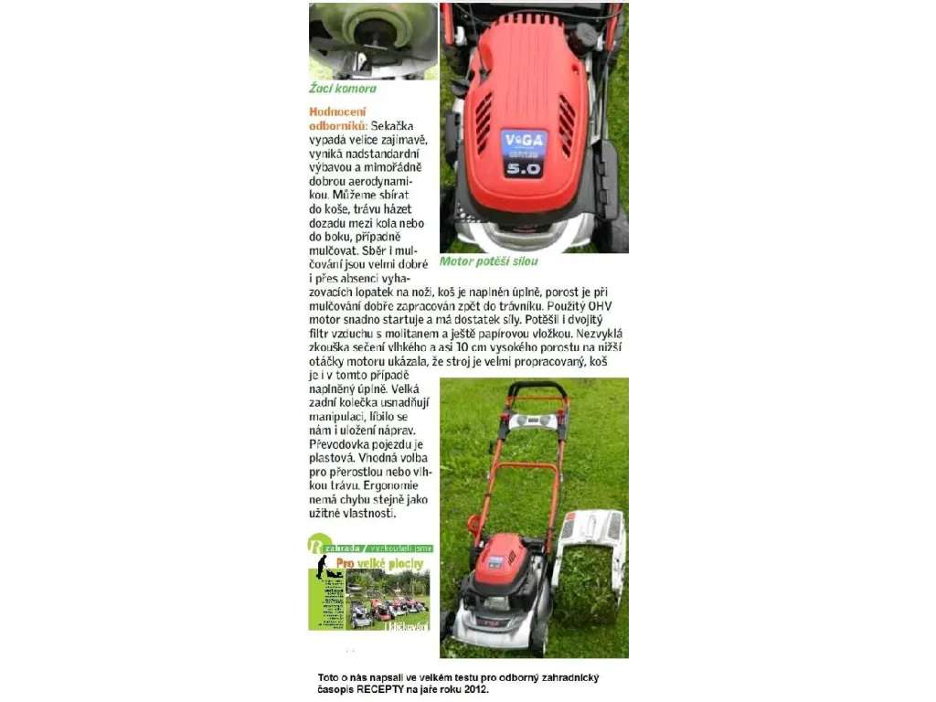 Hlučnost při nízkých otáčkách 2700 ot/min a rychlosti 3 km/hod byla 74 dB což byla suveréně nejnižší hodnota z testovaných strojů. Při standardní rychlosti 4 km/hod a otáčkách 3090 ot/min si sekačka bez problému poradila s jakoukoliv přerostlou trávou. Sekačka VeGA 485 SXHE při těchto testech vždy naplnila vrchovatý koš.Velká zadní pojezdová kola i přední kola jsou uložena v oboustraných kuličkových ložiscích, centrální nastavení výšky sečení je u značky VeGA samozřejmostí.