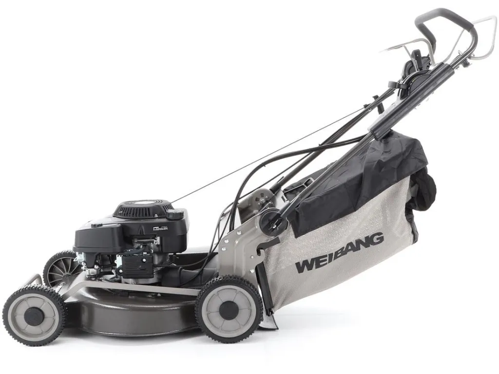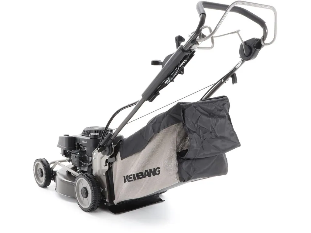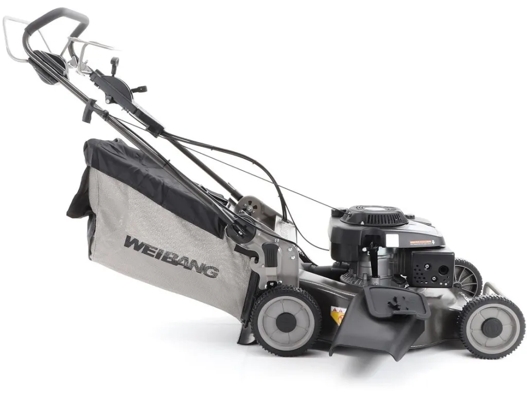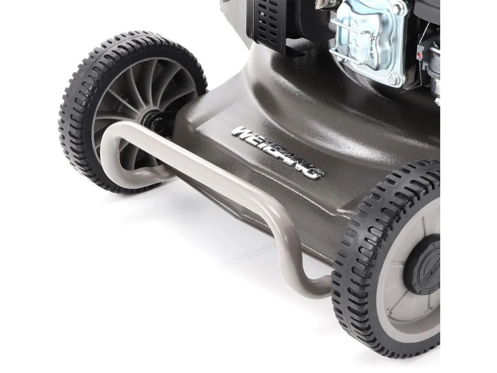 bočním výhozem, mulčovat i zadním deflektorem a má variabilní pojezd daný profesionální 3-rychlostní kovovou převodovkou. Výhoda silného motoru WEIBANG o super výkonu 7 HP a nože s velkými lopatami Vám perfektně sebere i přerostlou mokrou trávu.