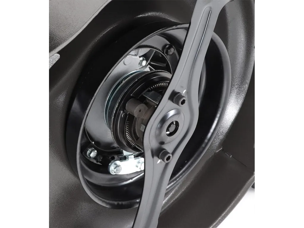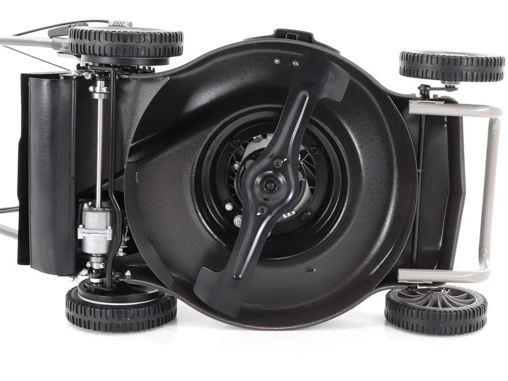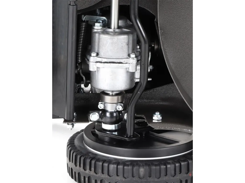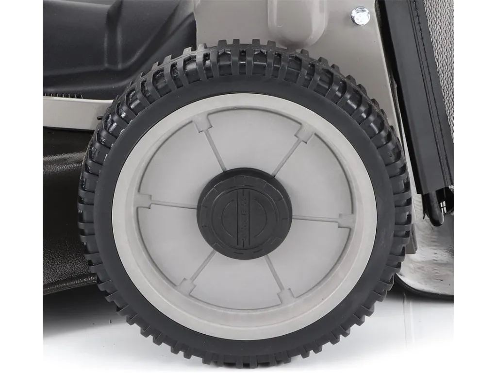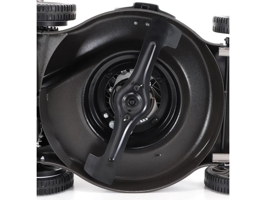 Pogumovaná sendvičová AL kola jsou uložena v oboustranných kuličkových ložiscích, centrální nastavení výšky sečení je u této značky samozřejmostí. Velkým nadstandardem u této sekačky je použita speciální profi BBC spojka nože,