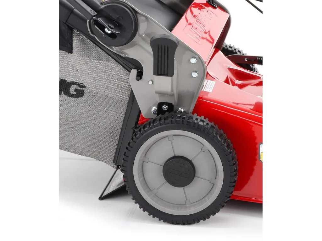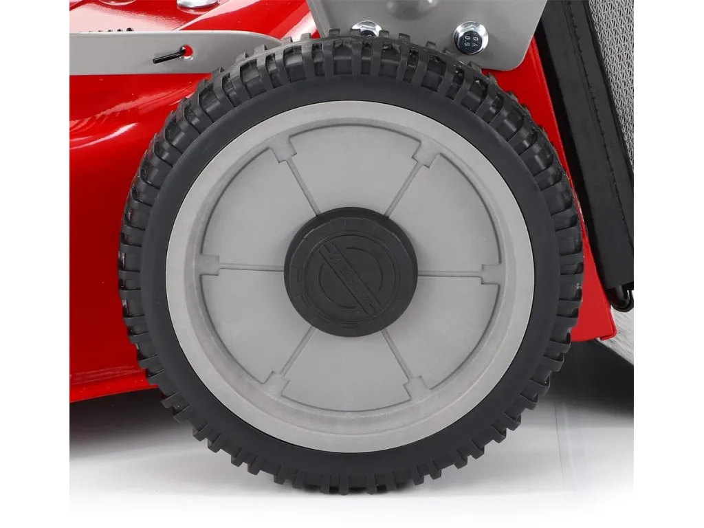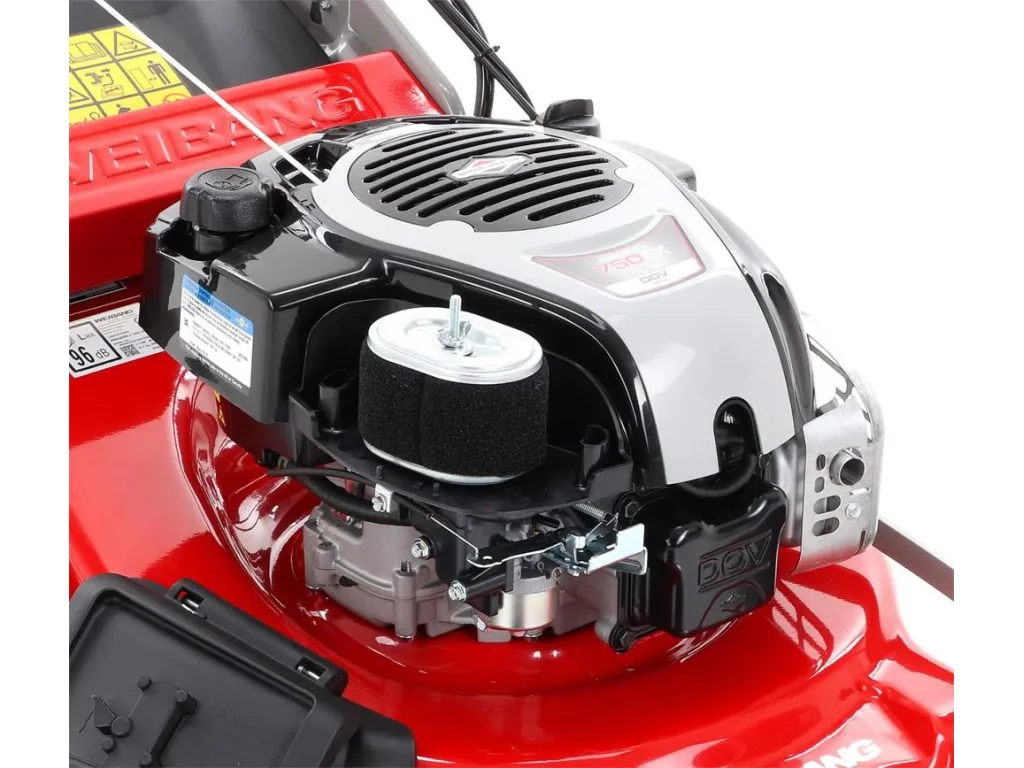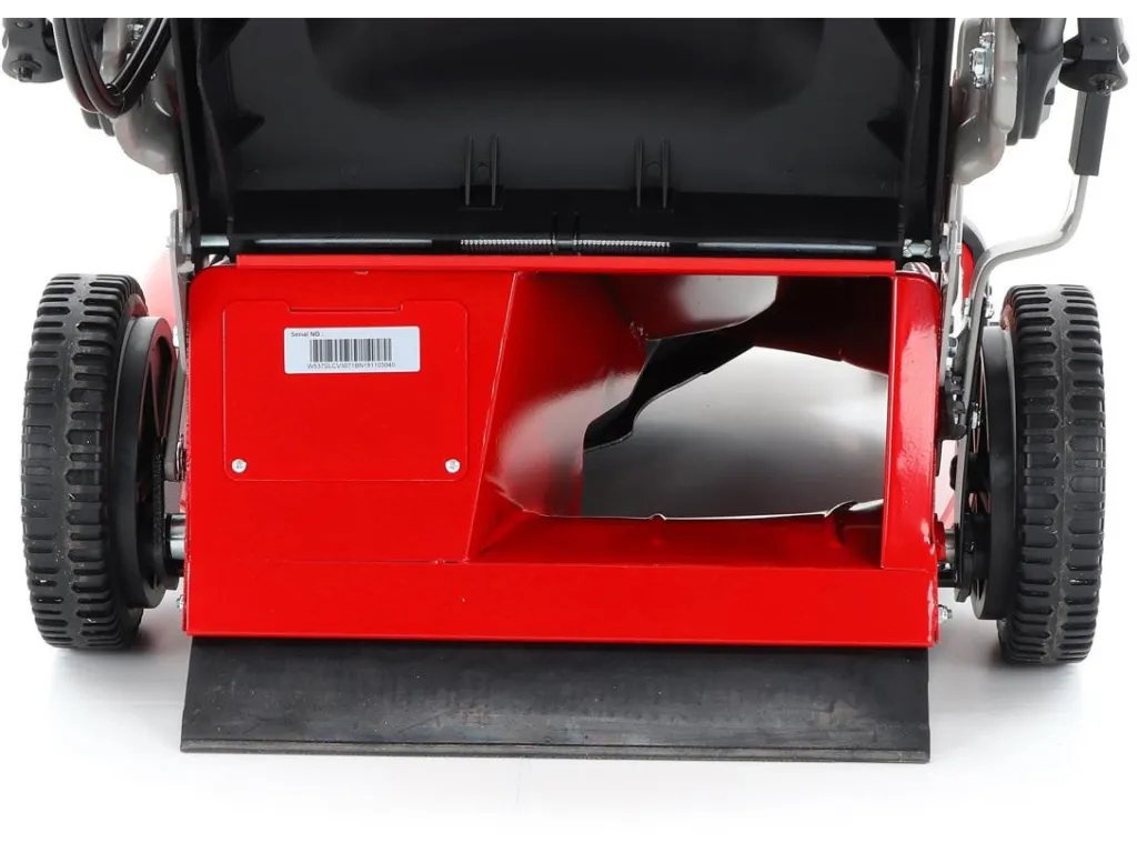 zadním deflektorem a má variabilní pojezd daný 3 rychlostní variátorovou převodovkou. Výhoda silného motoru o výkonu 6 HP a nože s velkými lopatami Vám perfektně sebere i přerostlou mokrou trávu. Pogumovaná sendvičová kola jsou uložena v oboustranných kuličkových ložiscích,