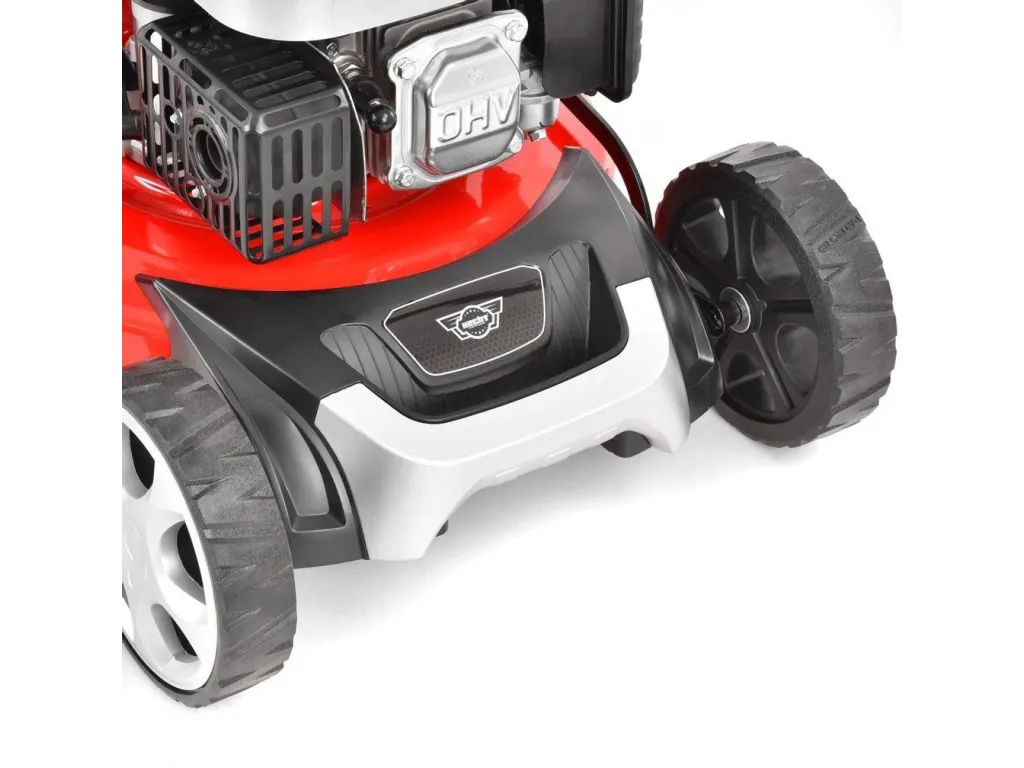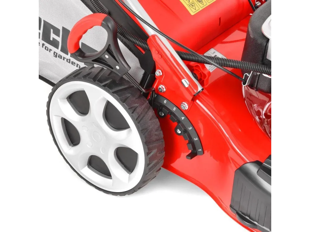 Motor a funkcie kosačkyPre pohon bol použitý osvedčený Hecht OHV motor s obsahom 135 cm3 a výkonom 2,4 kW. Stabilný a pevný kovový skelet je opatrený otvorom so záslepkou pre bočné vyhadzovanie. Súčasťou dodávky je aj kryt bočného vyhadzovania, ktorý umožní kosiť trávu v režime bočného vyhadzovania. Vďaka tomu je možné kosiť aj ľahko prerastenú trávu, bez toho, aby sa kosačka hltila a obsluha šliapala po pokosenej tráve. V normálnom režime je pokosená tráva zbieraná do 60 l textilného koša. Kôš je vybavený aerodynamickou klapkou pre jednoduchú kontrolu stavu jeho naplnenia. Nastavenie výšky kosenia sa vykonáva centrálne, jedinou pákou pri ľavom zadnom kolese v rozsahu od 25 do 75 mm. Kolesá sú samozrejme osadené na guličkových ložiskách. |