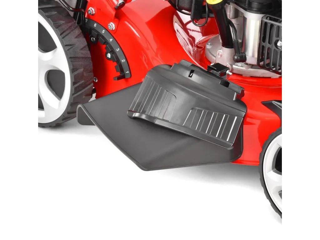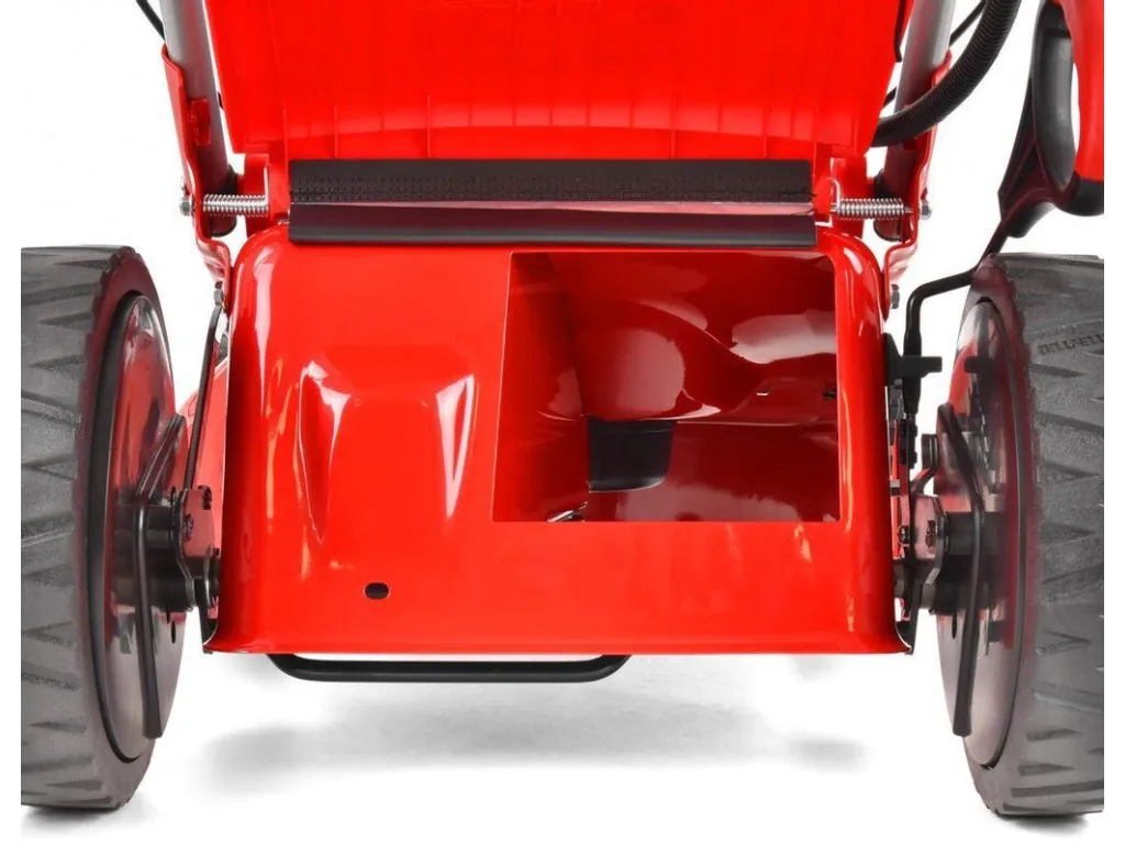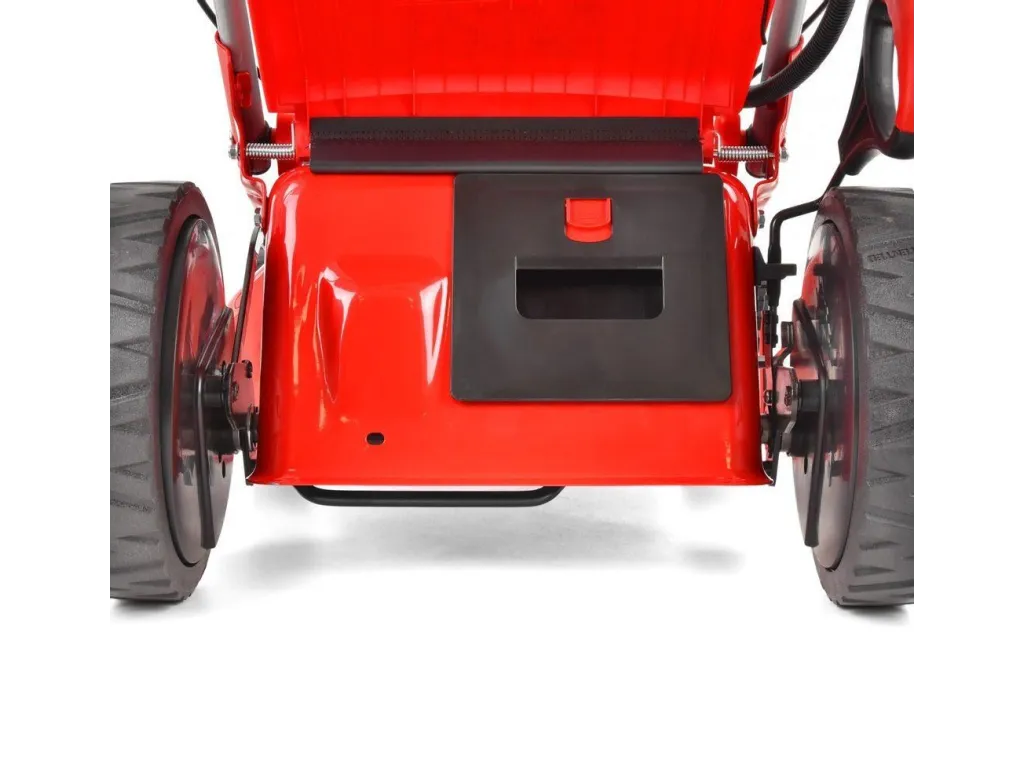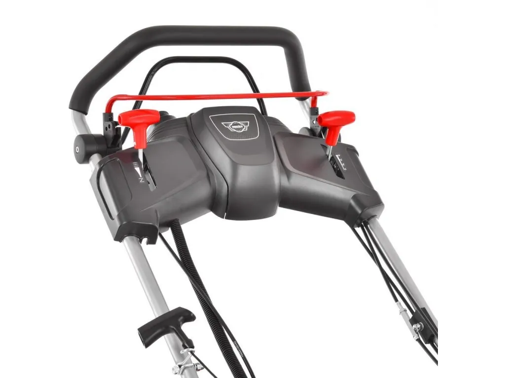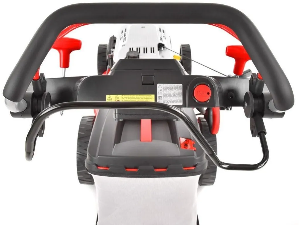 Pohodlné polstrované madlo je možné vďaka rýchloupínaniu jednoducho zložiť pre uskladnenie, alebo prepravu kosačky a je opatrený už zmieňovanou zapaľovacou skriňou a úložným priestorom na drobnosti (kľúče, nápoj a pod.). Súčasťou dodávky je i nabíjačka akumulátora elektrického štartu. Hmotnosť kosačky je 39,6 kg. |