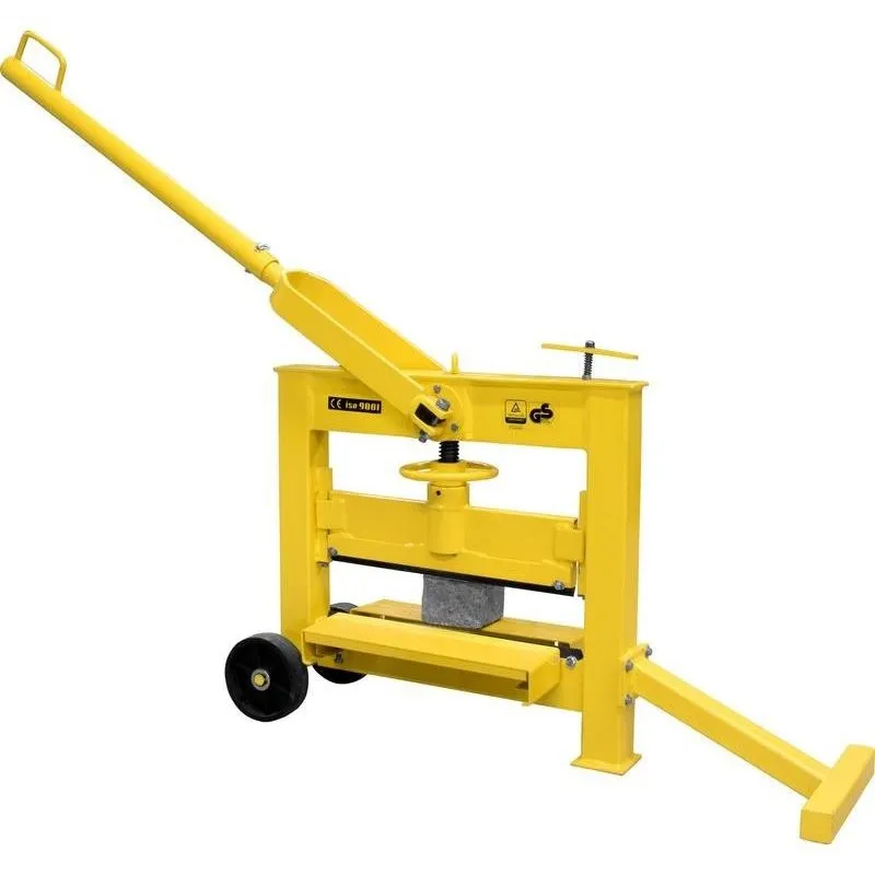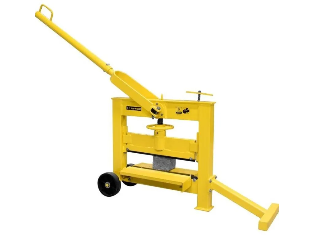 Lámačka kameň s odpruženými podperami, jednoduché nastavenie výšky štiepania cez centrálne závitové vreteno, potrebná menšia sila vďaka teleskopickej násade, podvozok pre jednoduchý presun, výmenný nôž s troma čepeľami. Na lámanie kameňa, dosák, obrubníkov.