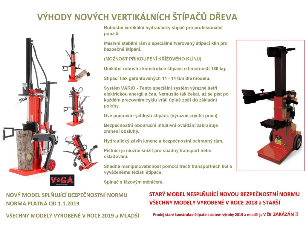 Štiepačka VeGA LV1410PRO VARIO je novým modelom pre rok 2020, ktorý je konštruovaný podľa nových prísnych bezpečnostných noriem EÚ. Je vybavená silným elektromotorom 400 V s výkonom 3500 W, ktorý vyvinie štiepací tlak 14 ton. Štiepací klin má dve rýchlosti štiepania a nízku základňu, vďaka ktorej nemusíte polená zdvíhať, stačí ich "nakulit". Veľmi ťažké poleno navyše stačí položiť na bočné rameno spojené s piestom štiepačky, ktoré vám pomôže poleno postaviť.