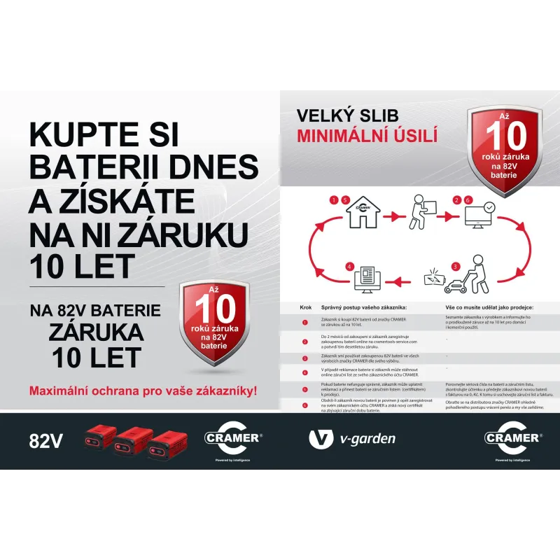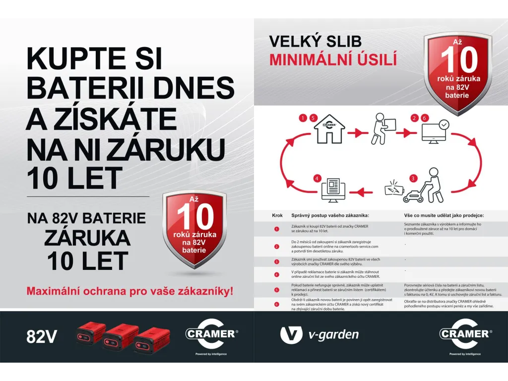 *Do 2 měsíců od zakoupení si zákazník zaregistruje výrobek nebo baterii online na www.cramertools-service.com a potvrdí tím rozšířenou záruku a získá certifikát.