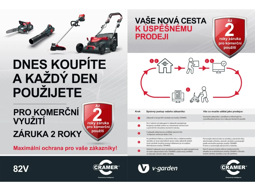 - v případě registrace lze rozšířit záruku na 2 roky pro 82V stroj pro komerční využití.