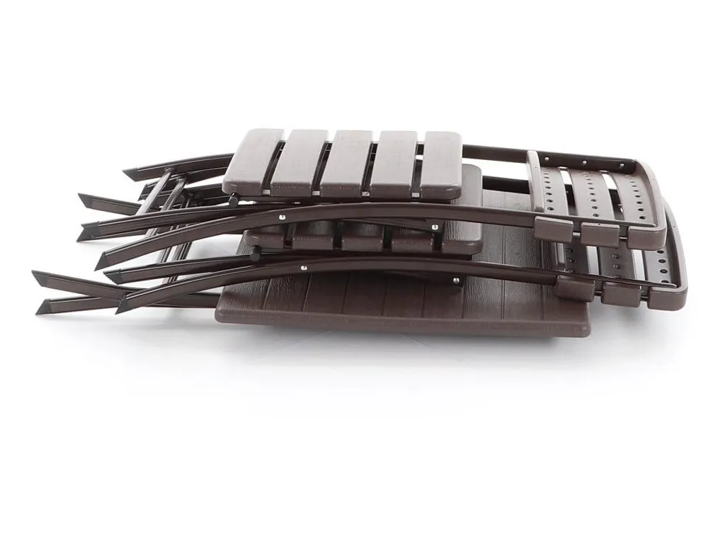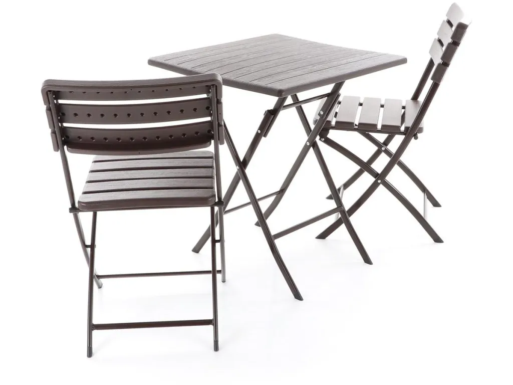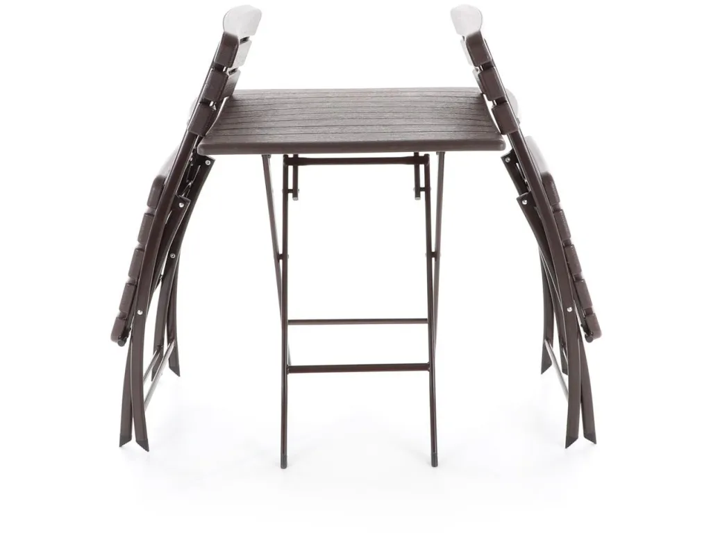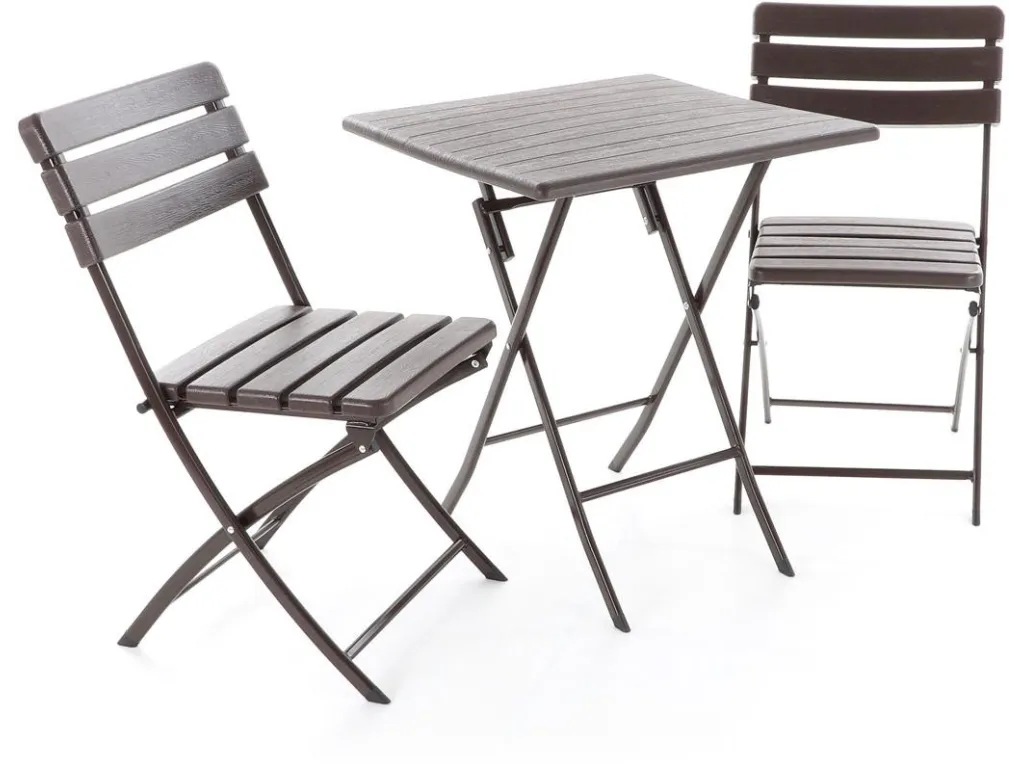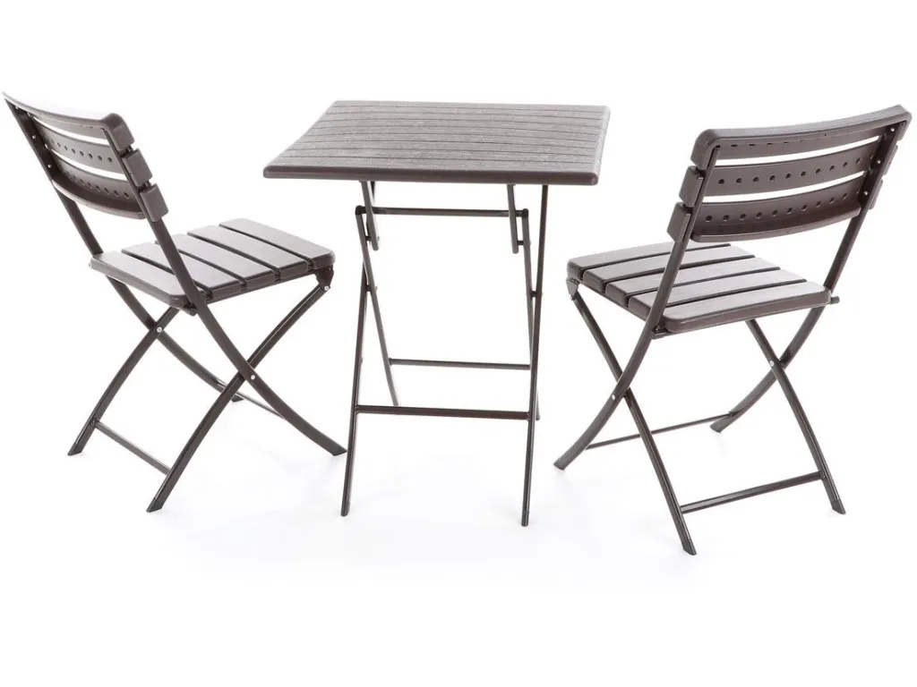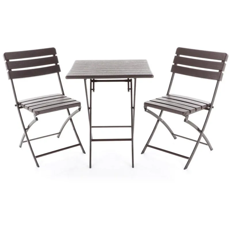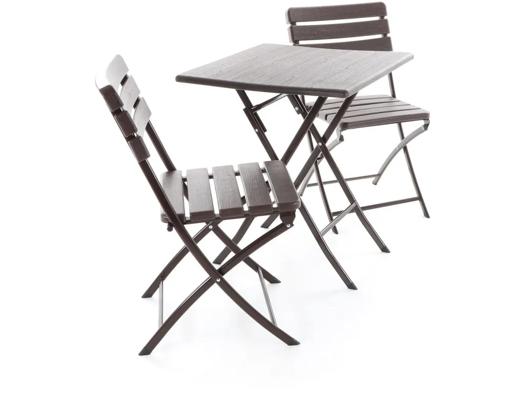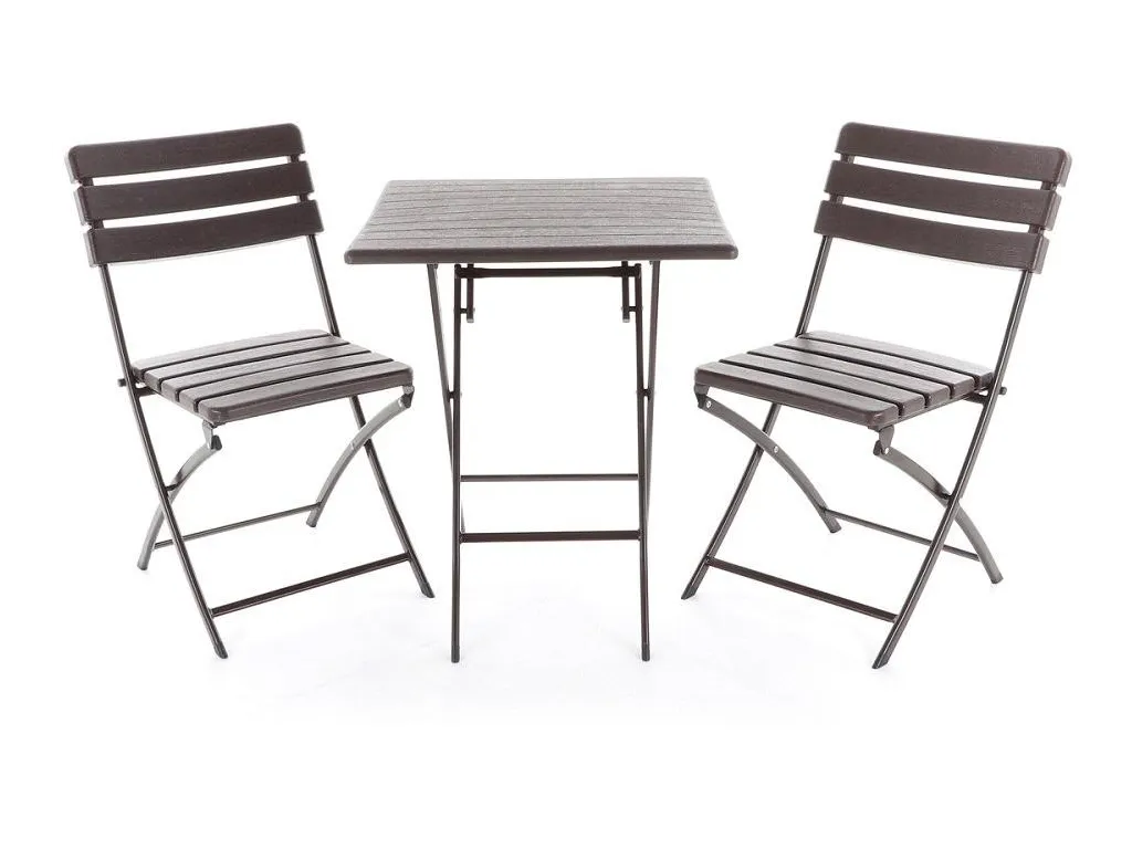 Stolová zostava dvoch skladacích stoličiek z oceľových profilov povrchovo dokončená komaxitovou farbou , čalúnenie je v imitácii masívneho dreva z lisovaného plastu s UV filtrom , určená do interiérov, exteriérov a pergolových priestorov.