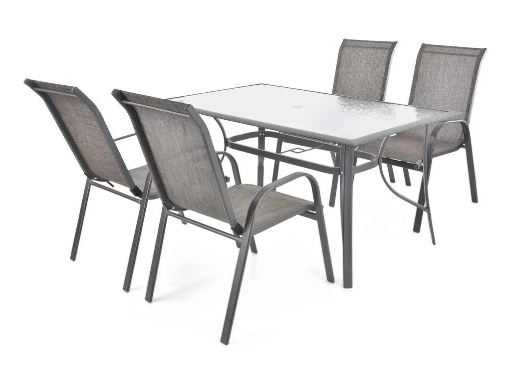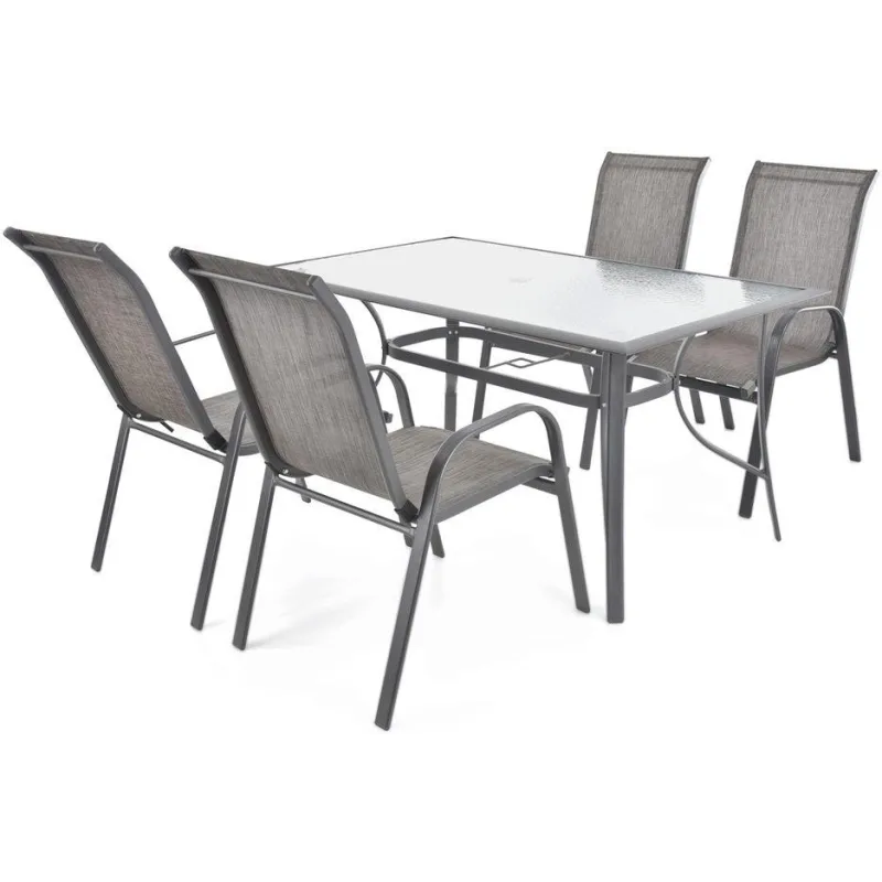 Kombinovaný set štyroch stoličiek a stola z hliníkových profilov a komaxitovou povrchovou úpravou. Stôl s tvrdeným sklom. Vhodné pre použitie v interiéri, exteriéri aj vo vlhkom prostredí. Použitie odolného výpletu stoličiek v spojení s hliníkovými profilmi zaisťuje vysokú odolnosť proti vlhkosti a nízku hmotnosť. Pre zvýšenie životnosti sa však odporúča nenechávať zbytočne dlhodobo nábytok vystavený prírodným vplyvom.